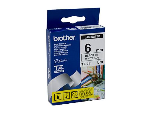 - TZE211 TZE211 BROTHER 6MM BLACK TEXT ON WHITE TAPE - 8 METRES